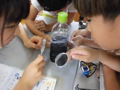地面から水蒸気が出ているのか調べました。プラスチックの皿を地面にかぶせて置いておくと、少しだけ曇っていました。そこで曇っているもの(冷やしたペットボトル)の周りの様子を虫めがねで観察したところ、水の粒であることがわかりました。
