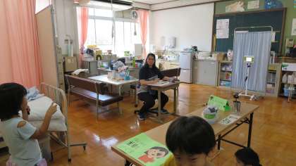 1年生は、視力検査を行いました。検査の前に自分の名前を言ってから見えた方向をきちんと伝えることができていました。また、使い終わった遮眼子をアルコール消毒し、元の場所にきちんと返すことができていました。