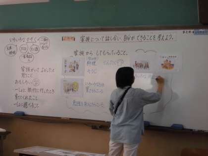 4年生は、家族には多様な在り方があることを知り、家族を大切にすることについて考えました。家族といてよかったと思うことを交流したり、家族にしてもらっていることを出し合ったりしました。その中には自分にもできることがあることに気づき、自分でできることをこれから頑張っていこうと思いました。