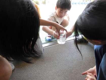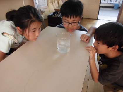 水蒸気はどこにでもあるか調べようということで、ビーカーに入れた氷水で空気を冷やして、水滴がつくかどうか調べました。理科室の中や廊下、4年の教室などいろんなところで確かめて、どこにでも水蒸気はあることがわかりました。