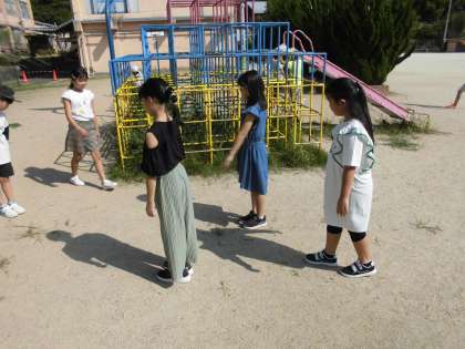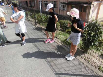 運動場でかげについて確かめました。いろいろなものにできているかげの向きと、自分にできているかげの向きと比べました。友達どうしのかげやフェンスのかげを比べると同じ向きになっていることがわかりました。