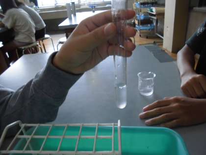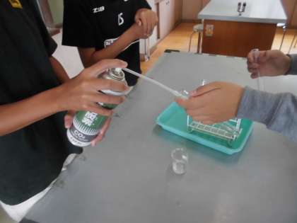 二酸化炭素は水に溶けるかどうか調べました。炭酸水から出る泡が二酸化炭素だという人がいたので、石灰水で白く濁るか調べました。それで炭酸水には二酸化炭素が溶けているということがわかりました。そこで、水を入れた試験管に、ボンベから二酸化炭素を入れて振ってみて、本当に溶けるか調べました。ほんのり白く濁って、わずかだけど二酸化炭素が溶けたことが確かめられました。