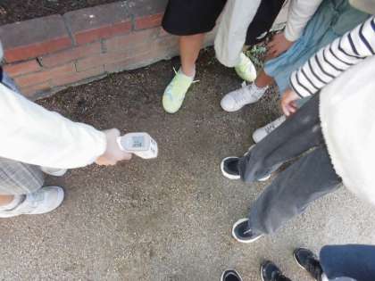 日なたの地面と日かげの地面の温度を放射温度計で測りました。棒温度計のように目盛りを読み取らなくても数字で表されるのでわかりやすく次々と交代しながら測っていました。