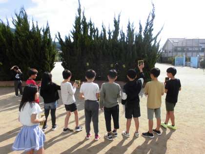 日光を鏡ではね返して、日光がどのように進むのかを調べていきます。今日は、鏡ではね返す練習をしました。校舎の壁を狙って、うまく当てられた人もいました。