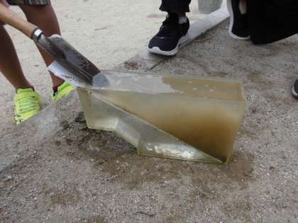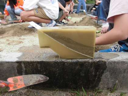 土地に縞模様が見られるのは、海の中で土が積もったからではないかと考えました。そこで、水槽の中に土を流し込んだらどうなるか調べることにしました。4回ほど土を流し込んで、積み重なることがわかりました。