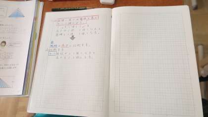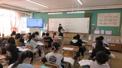 5年生は、算数「面積」の学習で三角形の高さや底辺の長さをかえたときの面積の変わり方から、比例関係があるかどうかを調べていました。高さが2倍3倍になると面積も2倍3倍となり、面積は高さに比例していることがわかりました。