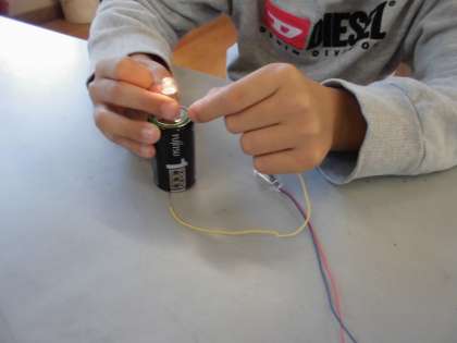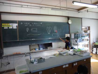 豆電球の仕組みを見て、豆電球のどこに乾電池の+極と−極とをつなぐと明かりがつくかを考えました。その後、乾電池と導線1本だけでつなぐことができるか取り組みました。一人が「できた。」と豆電球を光らせたら、次々とつなぎ方を試していって、いくつものつなぎ方を見つけることができました。