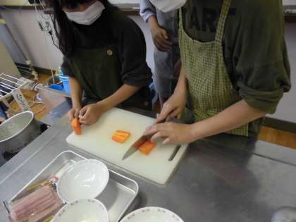 1食分の食事の献立を考えて、家族のために作れるように学習してきました。今日は、その1例として、野菜のベーコン巻きを作りました。にんじんを棒状に切ったものやさやいんげんを茹でてから、ベーコンで巻いて炒めました。にんじんを全部巻こうとして、太巻きになった人もいました。みんなでそろって、いただきますをしました。「おいしかった。」という人がたくさんいました。