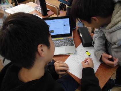 家族のために食事を作るにあたって、栄養のことや環境への配慮などについて学習してきました。実習として、野菜のベーコン巻きを作りました。それぞれの子どもが考えたメニューについて、学校で作ってもらうことはできないので、ノートで計画を立ててもらいました。料理の材料や作り方について、タブレットで調べる人もいました。後片付けで、油を紙でふき取ってから洗剤で洗うなど環境を大切にすることを考えている人もたくさんいました。