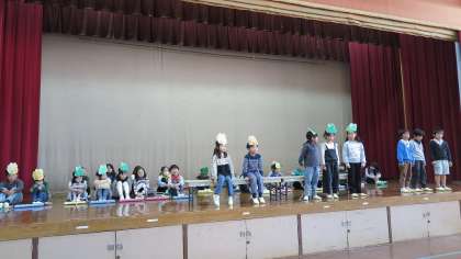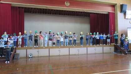 2年生の学習発表会では、国語「お手紙」で勉強した[「かえるくん」と「がまくん」の2人の優しく温かみのあるやり取りを音楽劇で表現する予定です。明後日の本番にむけて最後のリハーサルを頑張っていました。