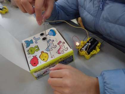 豆電球に明かりがつく回路を使って、接触してはいけない「ピカピカ棒」というおもちゃを作って楽しみました。アルミニウムの針金を自由に曲げて、輪を通していき、点灯させずにゴールできるか試しました。今日は「ピカピカ棒」を持って帰って、おうちの人にも楽しんでもらおうと考えています。