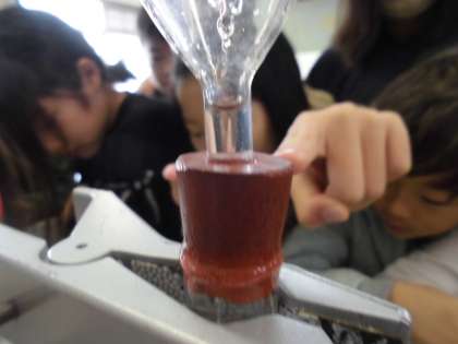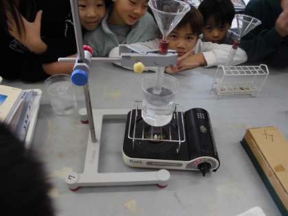 空気と水を温めたり冷やしたりして、体積の変化の違いを確かめました。一度、実験をしていても興味津々で結果を観察していました。