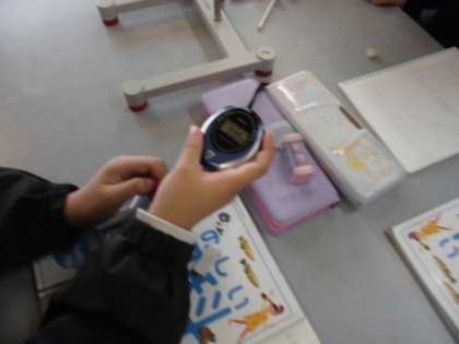 振り子の1往復する時間を短くする条件について考えました。まず、時間を計るので、ストップウォッチの使い方を練習しました。次に、おもりの重さによって変わるかを調べました。重さ以外の条件を変えないように気を付けて調べました。