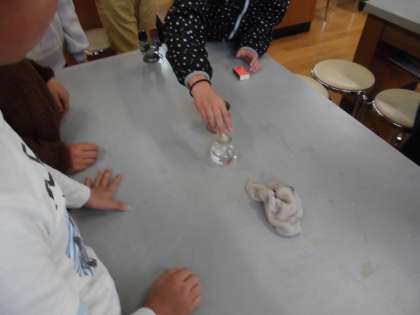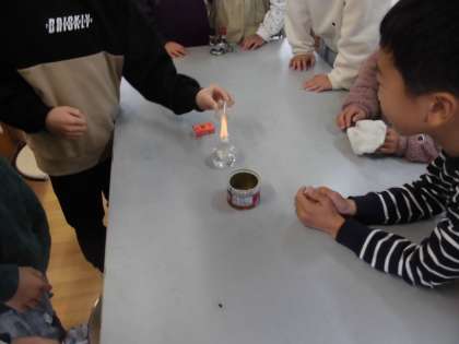熱するための道具としてアルコールランプの使い方を練習しました。マッチを擦って火をつけたり、キャップをかぶせて火を消したりしました。マッチ棒の持ち方に気を付けて、恐る恐るマッチを擦って火をつけていました。
