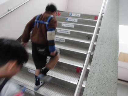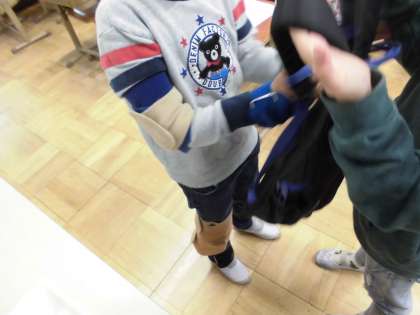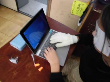 総合的な学習の時間に、高齢者体験をしました。腕や脚の関節にサポーターをまき、手首と足首におもりをつけ、白内障や緑内障を体験できるメガネをかけて歩いてみました。思っていた以上に動きづらいことが分かり、おもりを外した後には、高齢者の方の大変さを感じ取っていたようでした。軍手3枚を重ねてはめてタイピングもしましたが、キーが打ちづらく、難しさを体験できました。