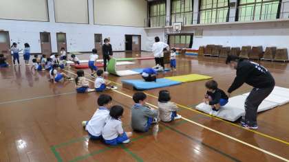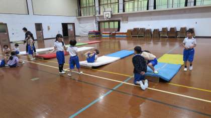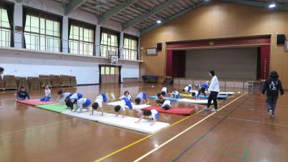 1年生は、体育の学習でマットあそびをしています。今日は、準備体操の後に後ろ転がりの練習をしました。手を頭の横に準備し、少し傾斜のついたマットの上を楽しそうに転がっていました。