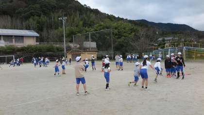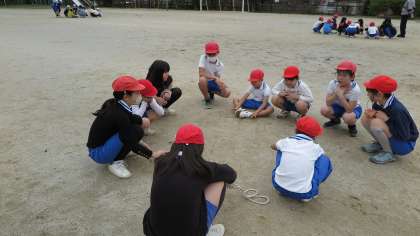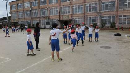 後半の個人戦が終わると、縦割りグループで八の字跳びに挑戦しました。中間休みに練習してきた成果を発揮しながら、みんなで楽しく八の字跳びをしました。優勝チームは、40回跳べたそうです。みんなで協力して頑張ることの楽しさを味わいました。