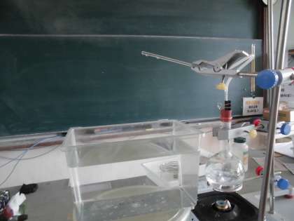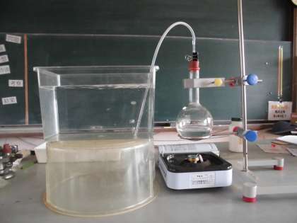 フラスコに入れた水を熱して、出てきたものは何かを確かめました。初めのうち出てくる空気は、水の中では泡になりました。沸騰した湯から出る水蒸気は、空気中に出すと白い湯気になりますが、水の中で出すと、冷やされて水になるため泡になりませんでした。