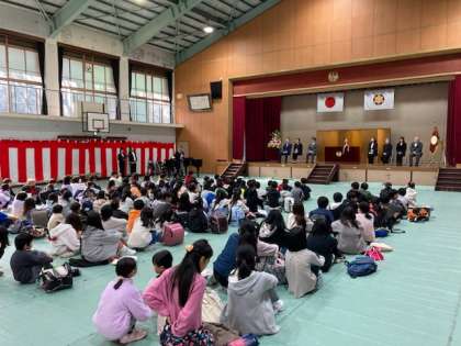 令和6年度になって異動してきた教職員の着任式を行いました。学校長から全員で9名の着任者を紹介した後、新6年生の児童代表が、お迎えの言葉を伝えました。