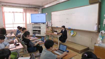 5年生は、学級シンボルマークを作成する学習の様子を見ていただきました。社会科で学習した県章マークのデザインを参考にしながら、自分の考えたマークをGIGA端末を使って作っていました。