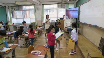 1年生の教室をのぞいてみると国語「どうぞよろしく」の学習でビンゴ大会をしていました。みんなとなかよくなる声かけ「どうぞよろしく」と丁寧にあいさつをしながらゲームを楽しみました。
