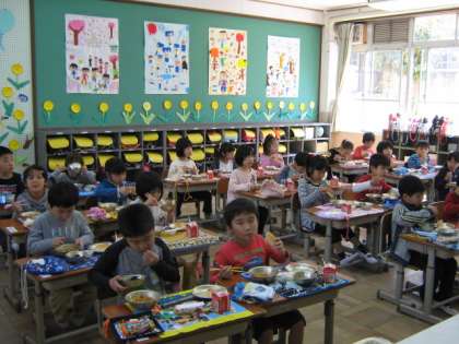 今日から給食が始まりました。初日は1年生の入学お祝い献立です。献立:小型コッペパン・牛乳・スパゲティのミートソース煮・ほうれん草のソティ・リンゴゼリーでした。1年生も「うっま〜〜」「おかわり!」と言いながらおいしそうに食べていましたよ。給食調理員さんも1年生も食べやすいように小さめに切り,心をこめて作ってくださっています。これから,どんどんすきな食べ物を増やしてほしいなと思います。