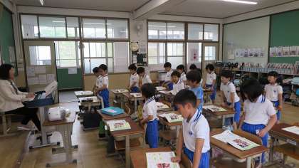1・2年生の交換授業が始まりました。今日から2年生は、1年生の先生に音楽を教えてもらいます。みんな楽しそうに「メッセージ」を歌い、素敵な歌声を教室に響かせていたました。