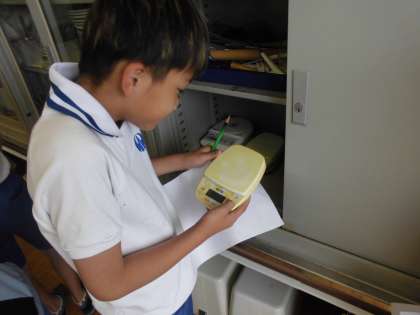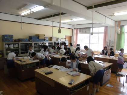 家庭科の学習で、家庭生活を支える仕事として、調理に必要な用具や食器の安全で衛生的な取り扱い方を確かめたり、衣服や住居を整えるための用具を探したりするために、家庭科室を探検しました。机の引き出しや扉を開けて、フライパンや鍋を見たり、ロッカーを開けて自動ばかりを確かめたりしました。