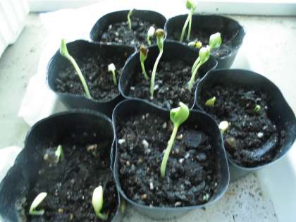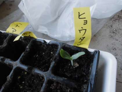 以前の学習で、一年草のツル性の植物の種をまきました。その中で、ビニールポットにまいておいたヒョウタンが発芽したので、班ごとに観察しました。