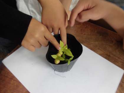 種が発芽したら出てくる子葉について学習しました。教科書の写真で子葉を調べた後、発芽したホウセンカの苗を使って確かめました。