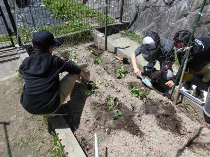 今年度、観察するヒョウタンの芽が伸びてきたので畑に植え替えました。実がぶら下がるように棚も作りました。