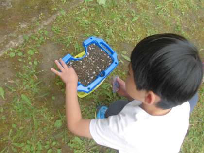 あさがおの種をまきました。種ちゃんのお部屋を作り、そっと種ちゃんを入れた後、やさしく土をかぶせ、水をあげました。早く芽が出ないかな。明日からは、毎朝の水やりをがんばろうね!
