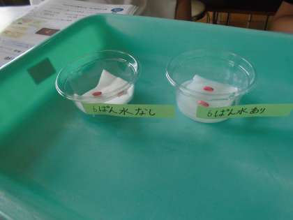 インゲンマメの種子が発芽するにはどんな条件が必要なのか調べています。水、空気、適当な温度についてそれぞれ有るものと無いものとで比べていきます。週明けにどうなっているか楽しみです。