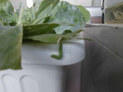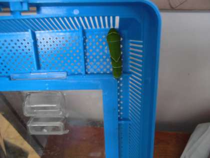 今日のモンシロチョウとアゲハチョウの幼虫の様子です。アゲハの幼虫は、ミカンの葉から離れて、ふたの裏でじっとしているので、間もなくさなぎになりそうです。