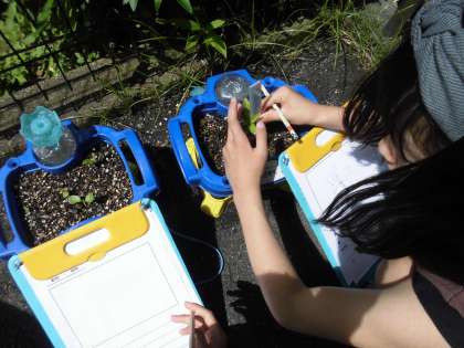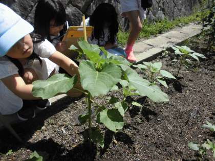 ホウセンカやヒマワリを観察しました。どちらも、葉の数が多くなり草丈も高くなっていました。