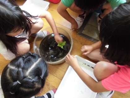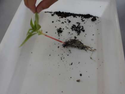 草丈が高くなってきたホウセンカの体のつくりを調べました。ポットで育てている苗についた土を水槽で洗って根のようすを確かめました。思っていたよりたくさんの細い根がついていて驚いていました。