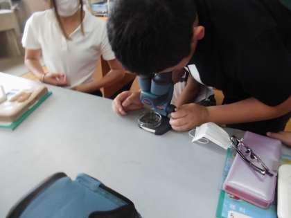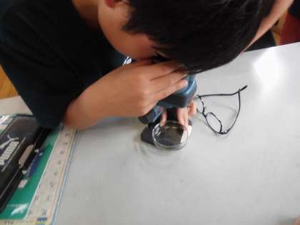 たまごの中で子メダカが育つ様子を調べた後、顕微鏡で育っている途中のたまごの様子を観察しました。