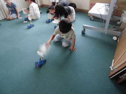 風が当たると車が動くかを調べるために、キットの車に紙の帆を立てました。今日は、息を吹きかけたり物で扇いだりして風を作り車の帆に当てて、車が動くか確かめました。