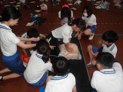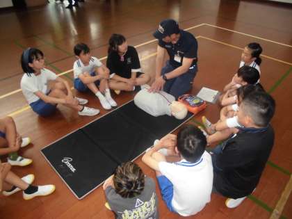 体育館では「救命入門コース」として胸骨圧迫の仕方、AEDの使い方を学び、実際に体験しました。