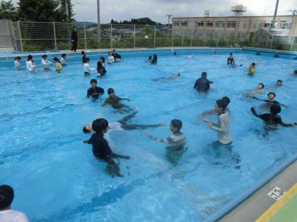 プールでは、靴を履いて服を着た状態で泳ぐ体験や浮かぶ体験をしました。