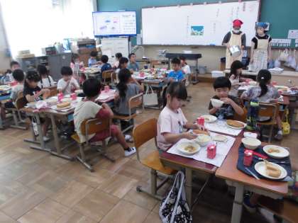 チキンのカレーあげは、子どもたちに大人気で、1年生でもおかわりにたくさんの手があがっていました。たっぷり野菜のビーフンは、いろどりがよく、パンにもよく合いました。