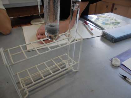 金属は塩酸に溶けるのか調べました。鉄でできたスチールウールはすぐに泡を出しました。アルミホイルを1cm角に切ったものはしばらくしてから盛んに泡が出てきて、どちらも溶けていることがわかりました。