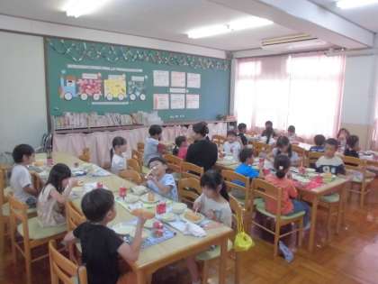そのあとは、はじめてのランチルームで給食を食べました。いつもより一段と給食を楽しんで食べていました。