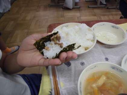 手巻きのりに肉みそ納豆とごはんをのせて、のりまきにして食べました。1年生もじょうずにのせて、食べていました。