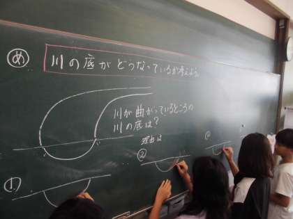 曲がっている川の底はどのようになっているかを、流れる水のはたらきをもとにして考えました。黒板に川底の様子を書いて、そう考えたわけを発表しました。川の内側は流れが遅いので、砂や小石などがたまりやすく、外側は流れが速いのでけずられて、底が深くなっていると予想しました。
