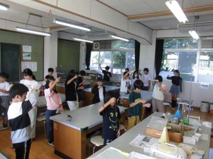 振り子の仕組みや名前などを確かめた後で、一人1つの振り子をもって1往復する時間を調べました。アンパンマンの曲をかけて同じリズムになるように確かめました。1往復する時間を変えるには、振り子の長さを変えたり、振り子のふれはばを変えたりすればよいのではないかと考えました。