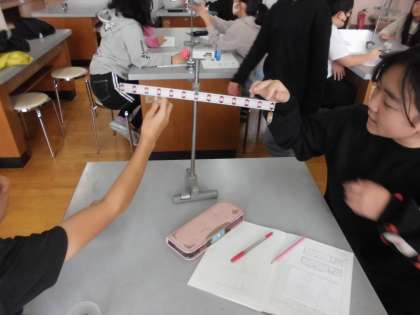 実験用てこのうでをかたむけるはたらきを重さで表すことを考えました。同じ重さのおもりなのに、吊り下げる場所によって、手ごたえが変わります。だから、支点からのきょりと関係があることがわかりました。