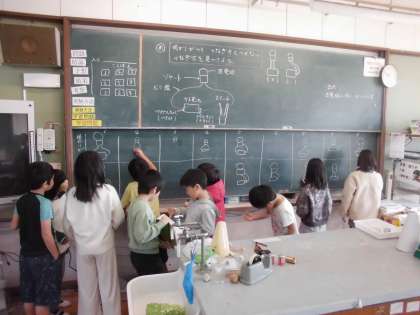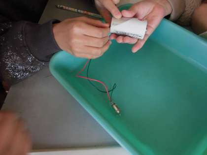 豆電球をつけたソケットと乾電池1つを使って、明かりがついたりつかなかったりするつなぎ方を調べました。それぞれで見つけたつなぎ方は、もう一度すべての班で確かめました。