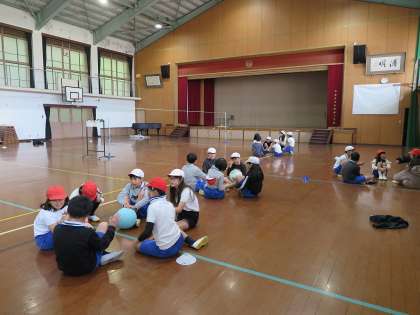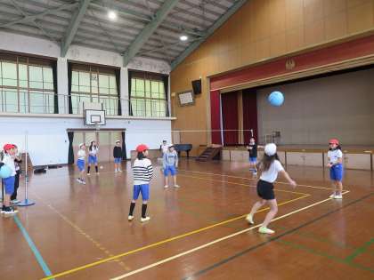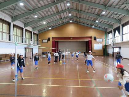 4年生は、体育「ソフトバレーボール」の学習をしています。どうすれば3回で相手にボールを返せるか班で話し合い、そのあと練習を始めました。みんなで声をかけ合いながら楽しくプレーしていました。