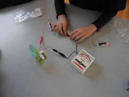 これまでに学習したおさらいとして、乾電池でモーターを回しました。回路の途中に簡易検流計をつないで、乾電池が1個の時と2個の時の電流の大きさを比べました。